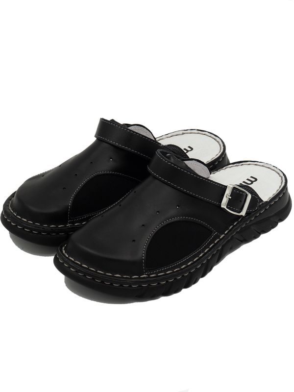 Модель прошита первоклассной итальянской ниткой, оснащена легкой перфорацией для воздухопроницаемости и специально установленной пряжкой для лучшей фиксации и регуляции объема сабо. Как дополнительная функция, ремешок откидывается назад, трансформируясь в задник и обеспечивая удобное расположение и фиксацию ноги при движении.