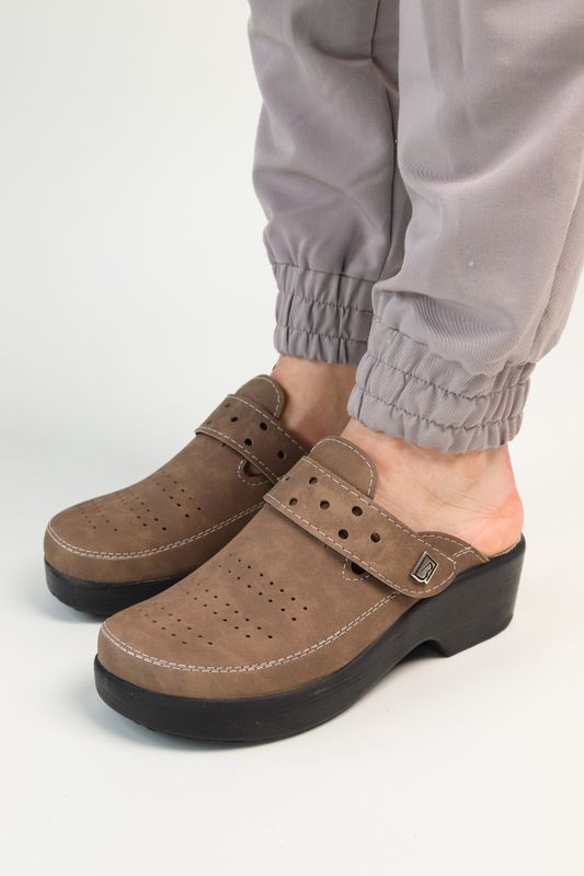 Невесомые женские сабо от BRAVO Comfort Anatomic из эко-нубука с перфорацией и подошвой из облегченного полиуретана.